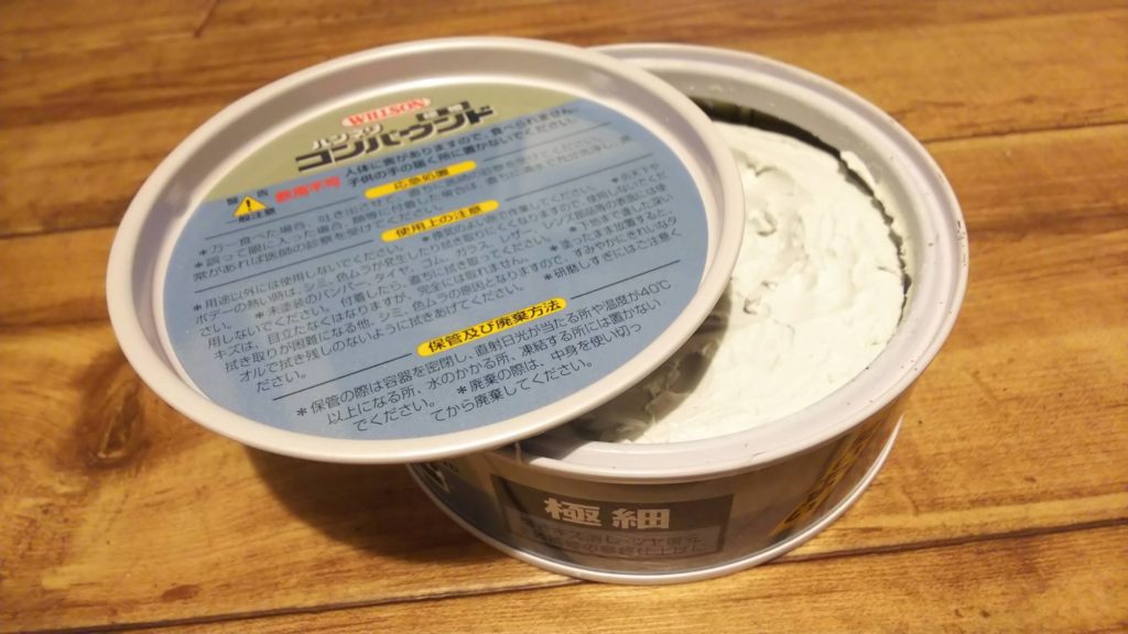 粗い表面を均しながら、徐々に粒子を小さくして表面を滑らかに整えます。ウエス等にコンパウンドを少量つけて磨きますが、同じウエスを使って、複数のコンパウンドが混ざらないようにして下さい。いつまでたってもきれいになりません。