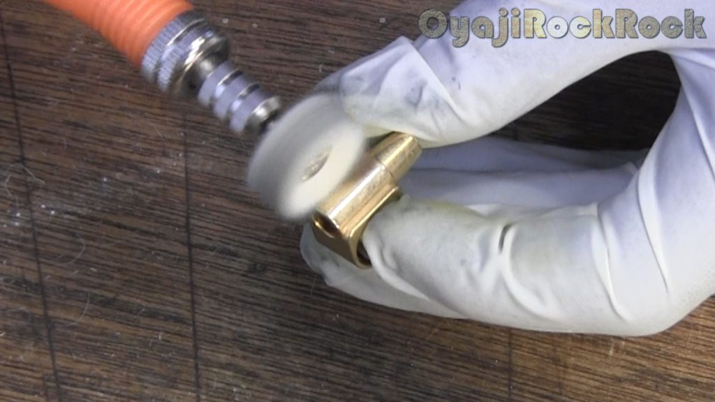 - リューターにバフのビットを付けて磨く時は、コンパウンドやピカールが周囲に飛び散ります。保護メガネを着用しましょう。また、回転部へ指を巻き込まれないようにしましょう。