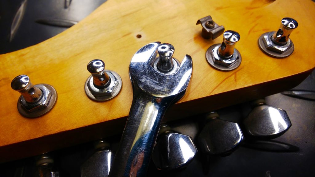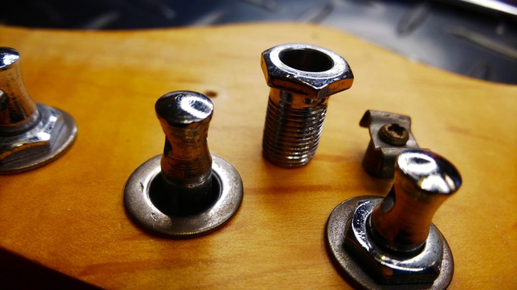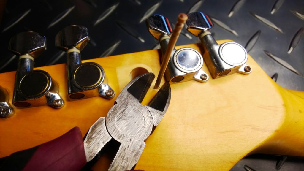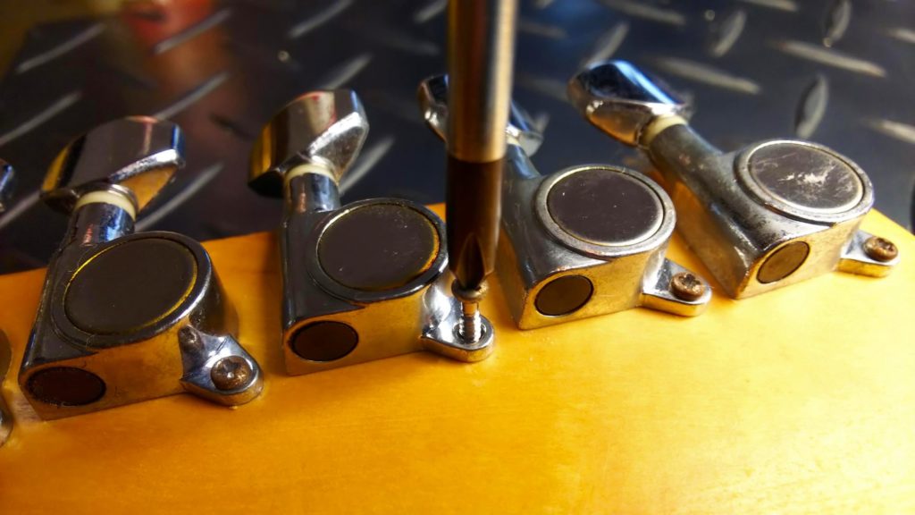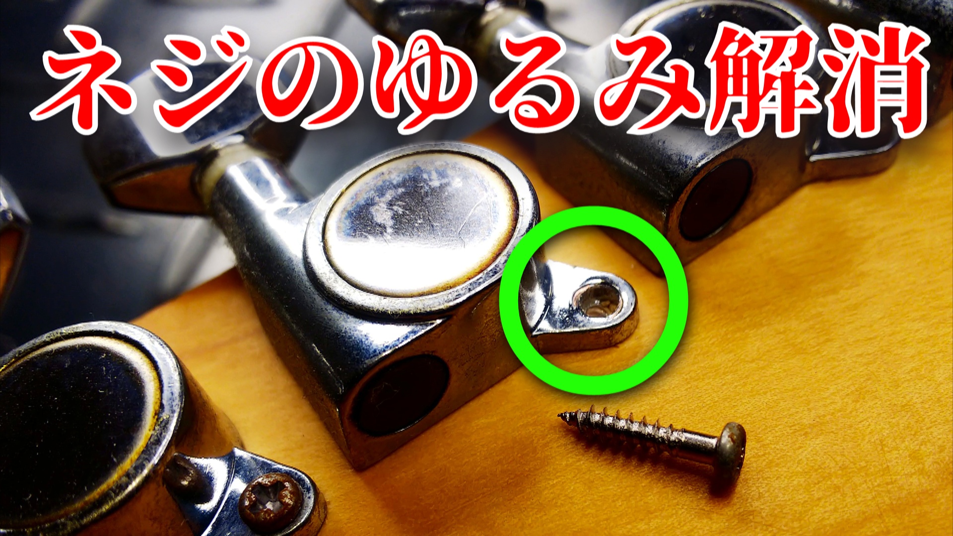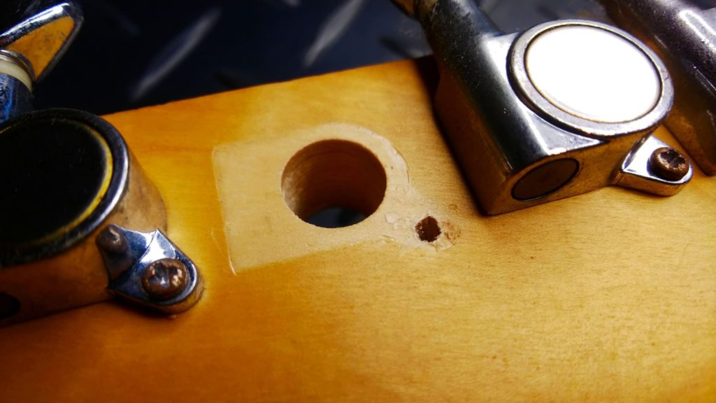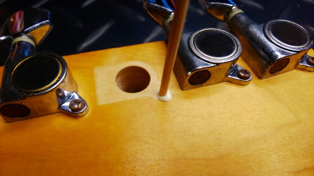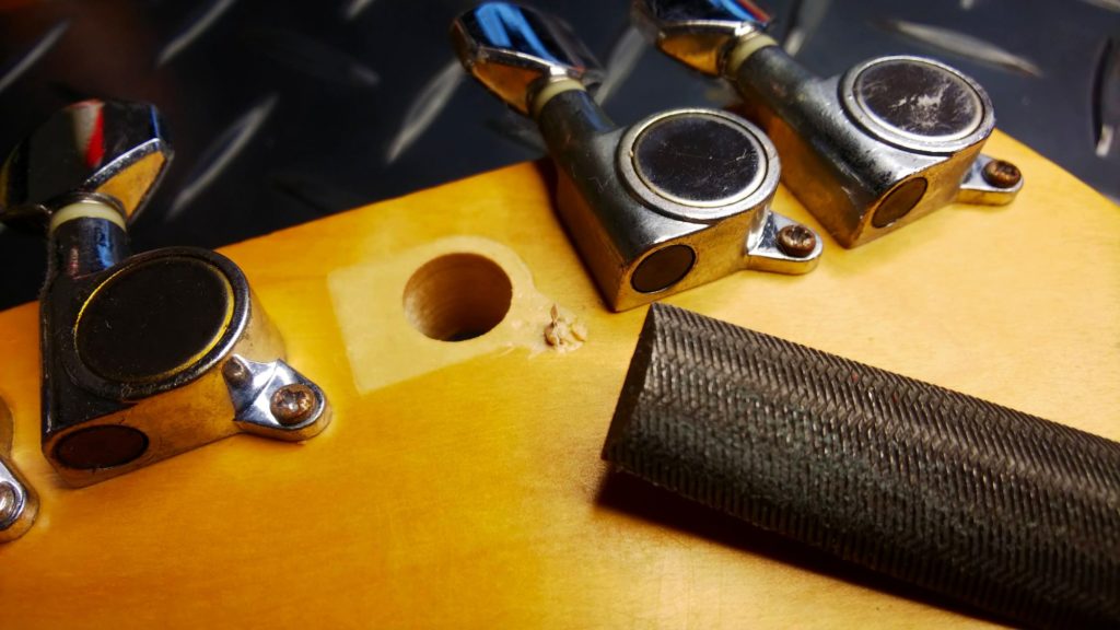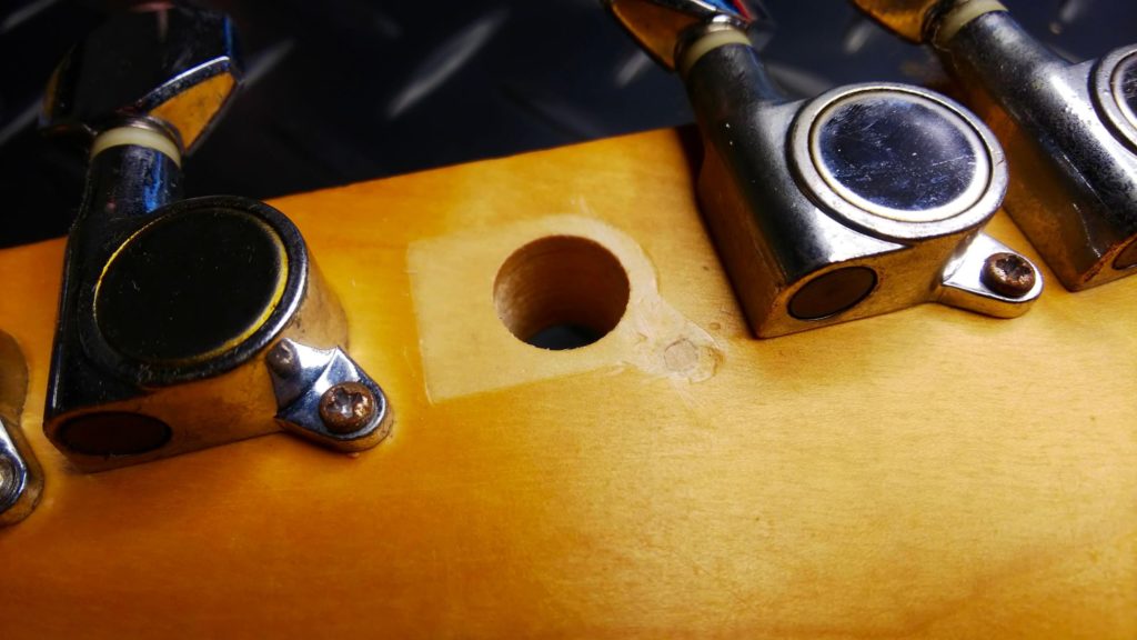木(ヘッド)のネジ穴がつぶれてひろがり、ネジがいつまでも回ってしまう状態です。ギターを倒したりぶつけたりした等など、ペグに大きな力を掛かってしまうとネジが耐えきれずに抜けてしまうことがあります。またメンテナンス時などにネジを締めこむとき、力を入れすぎてネジ穴をつぶしてしまうことがあります。電動ドライバーなどで締めすぎた場合にも起こります。締めすぎは禁物です。壊れたネジ穴は簡単に修復、再生することができます。