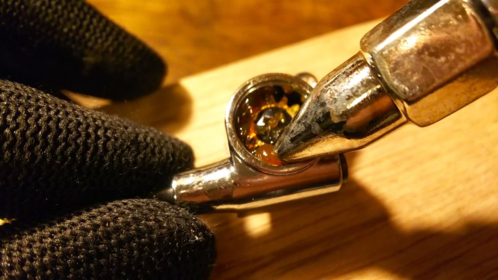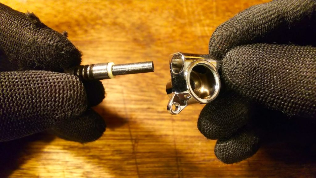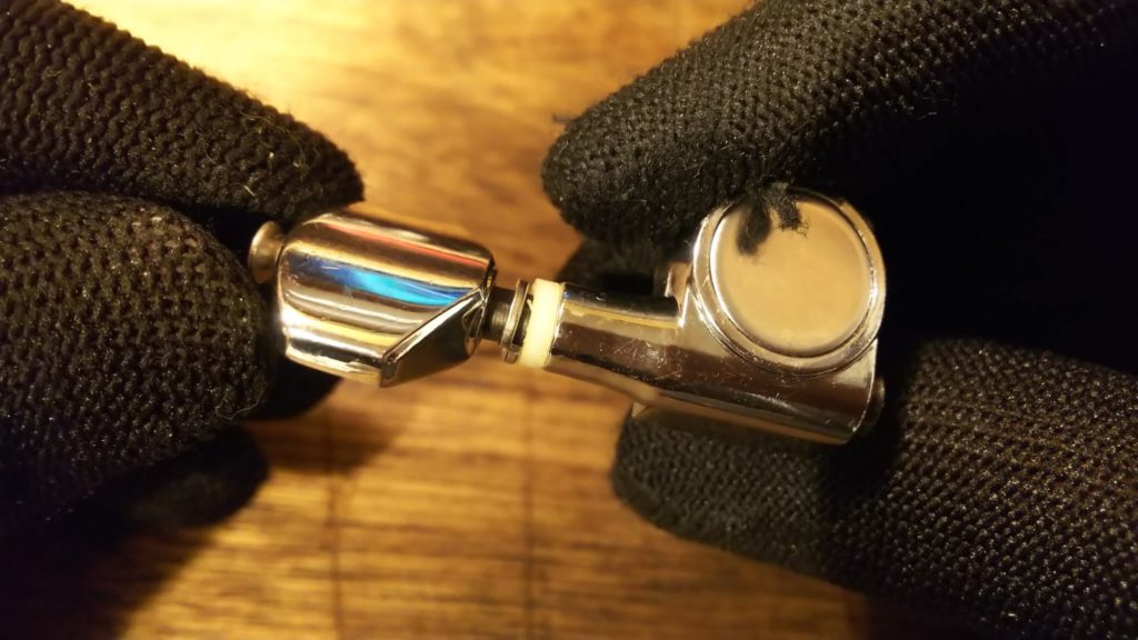 ④ギアの周りにグリスを充填します。グリスガンを利用すると簡単に注入できます。グリスを入れたらペグを回して、ギア部分に馴染ませながら追加注入します。常に動いて熱をもつような部品ではないので、グリスの種類は柔らかすぎなければ何でもかまわないと思います。