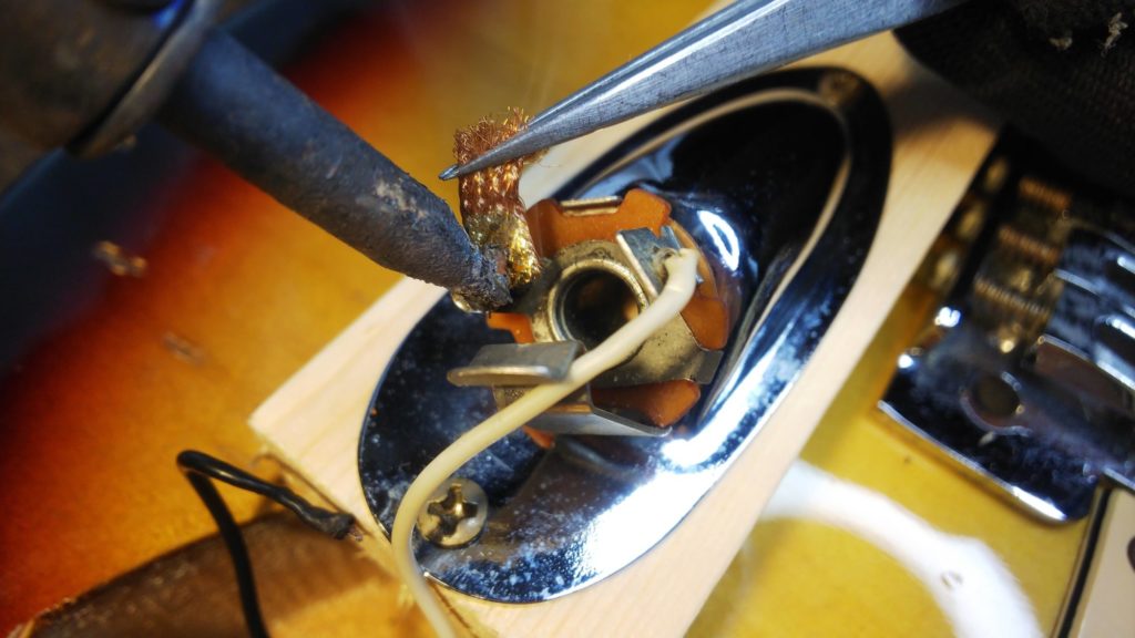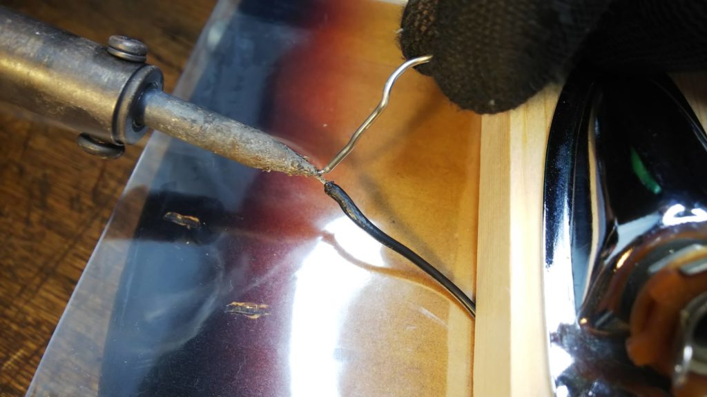 シールド―コードを差す角度を変えると、音が出たり出なかったり… 少し叩いてみれば音が出るようになったり… ブーンというノイズだけで音が出なかったり… なんとかその場を乗り切って使っていても、ついには音が出なくなってしまいます。私も何度か経験しました。この症状の場合、ジャックの配線かシールドコードの配線が切れているか、切れかかっている状態だと思います。まずシールドコードのキャップを開いて内部の配線が切れていないか確認してください。シールドに問題がなければギター側の断線を疑います。ジャックを外して内部を確認してみましょう。