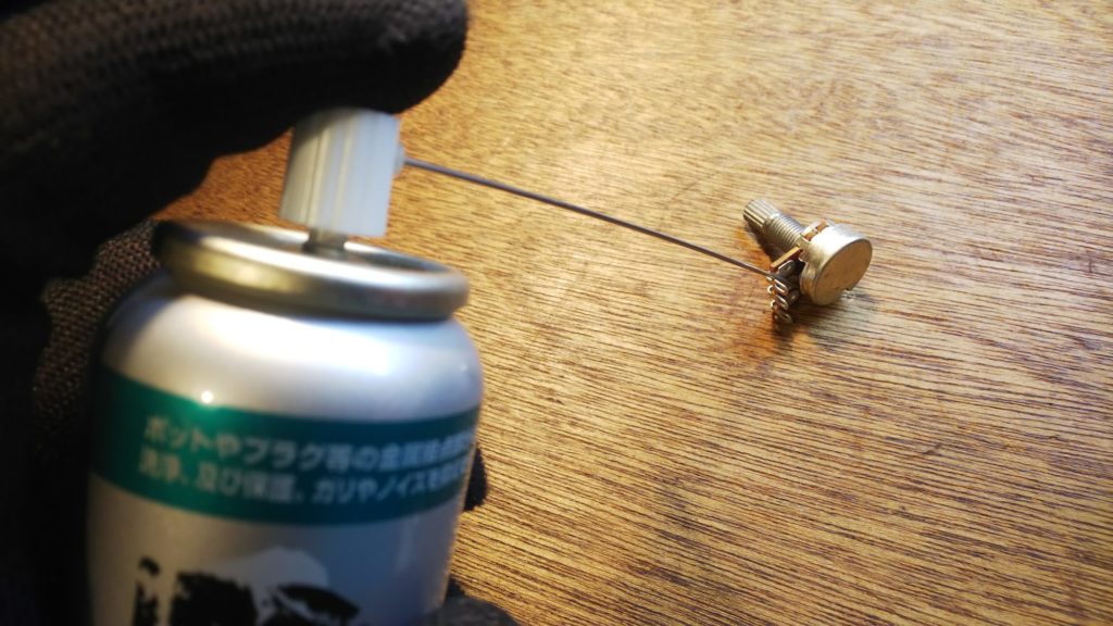 このトラブルを簡単に解消できるのが「接点復活剤」です。私自身、よくお世話になっていまして、ジャバジャバ使っています。接点復活剤はジャックとシールドが当たるような部品の接点やボリュームポットの内部に吹くと、ある程度は通電機能を回復させられます。また潤滑効果で接点がすり減ってしまうのも防止できるそうです。電気なんて分野がまったくわかっていない私にとっては、魔法のようなスプレーなのです。