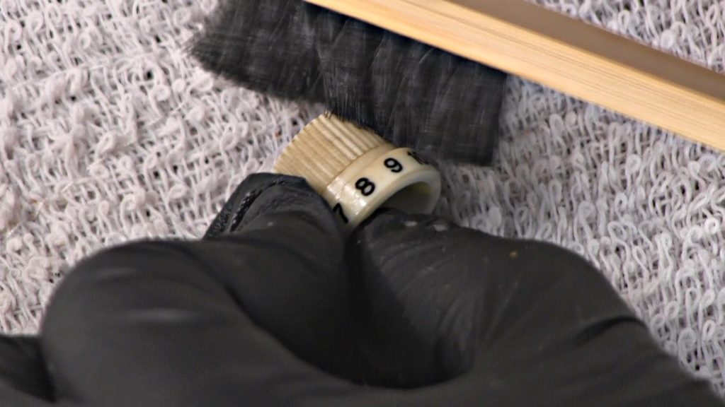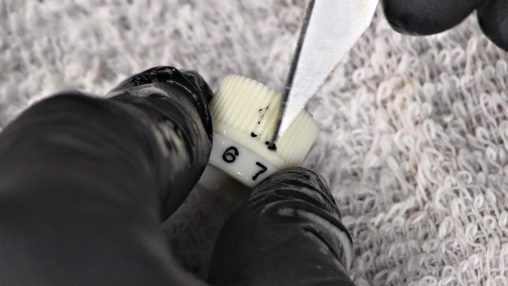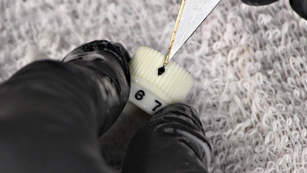 次に問題の黒い粒ですが、刃物の先端を使って剥がしてみることにしました。ノブに直接ふれるとひっかき傷が入ってしまうので、黒い物質だけに当たるように細心の注意をはらいました。