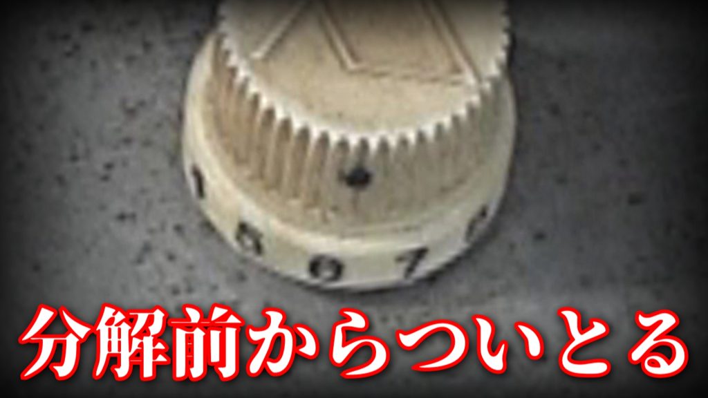 分解する前から黒い粒はついていたのです。ボリュームをどこまでまわしたのかわかるように印をつけていたのかとも考えましたが、本当のところは何だったのかわかりません。ポットを磨くシーンは12日目の動画 10:22あたりからご覧いただけます。