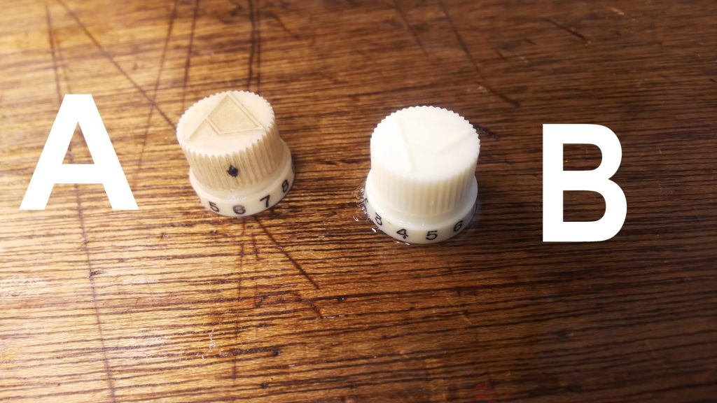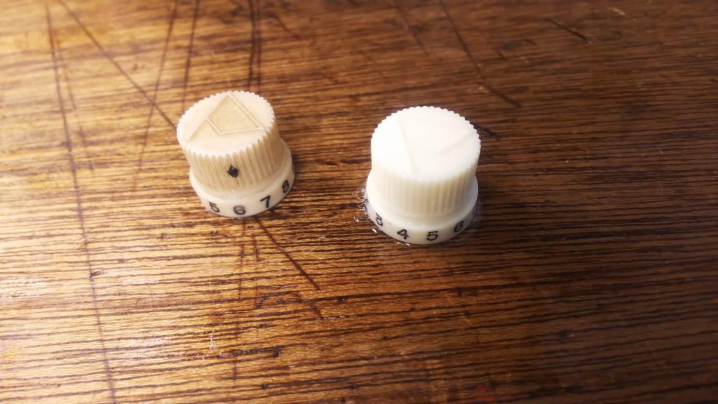 左のノブは磨く前です。全体的にホコリ、ヤニで茶色く変色しています。変色は樹脂の劣化によるものではありませんでした。右は磨いたあとのノブです。黒い粒はゴムのような質感の何かが付着していました。ピックアップを外した時にブッシュのゴムが腐ってネバネバしていたので、知らないうちに付いてしまったのかと思いました。しかしそれは間違いでした。