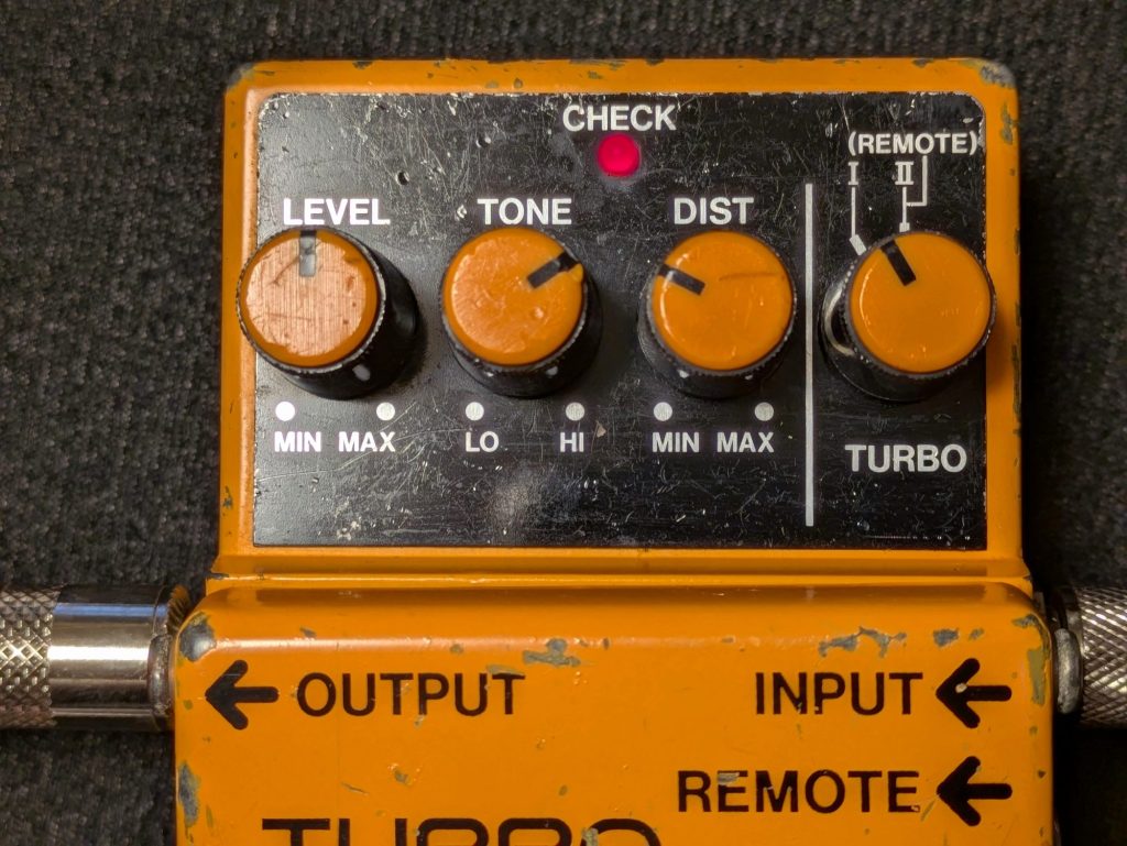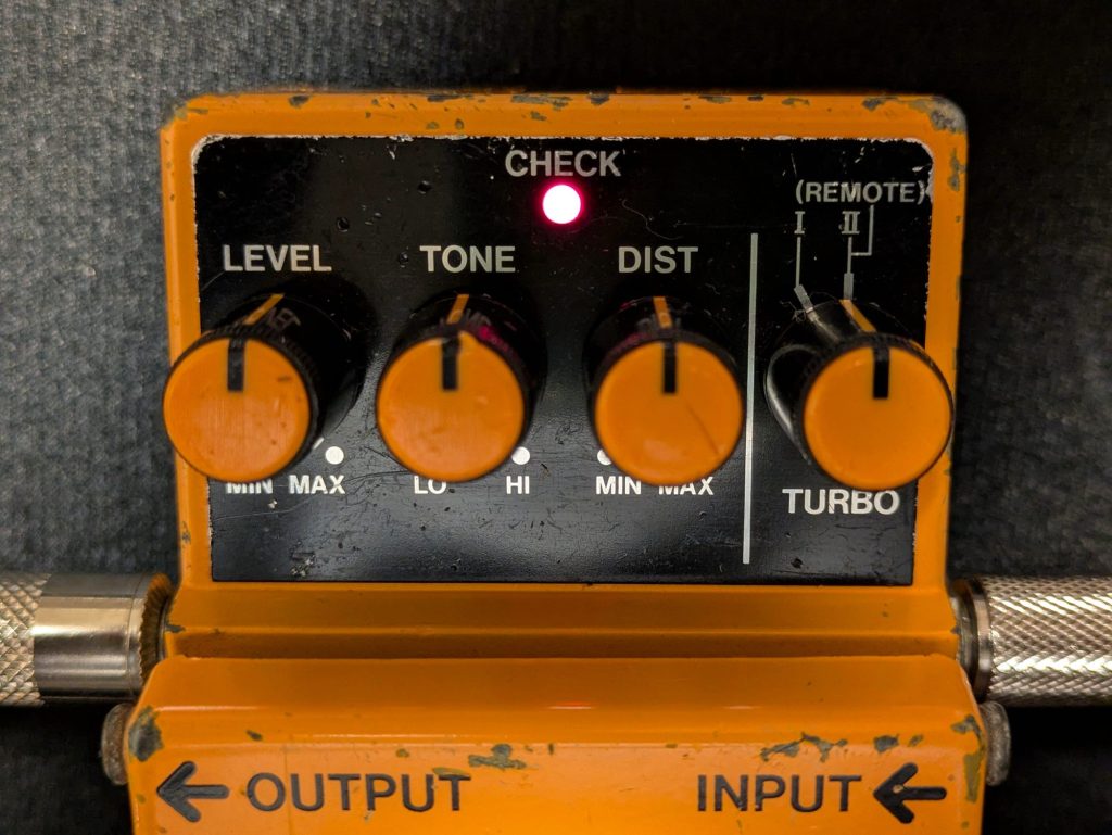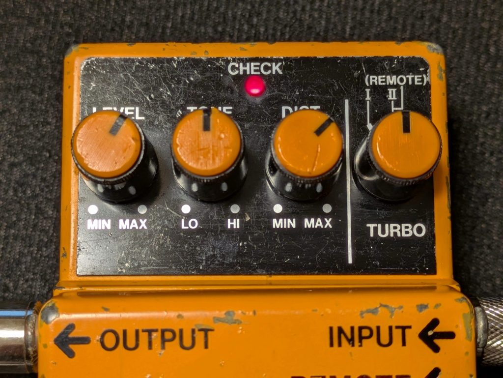 信号をハードクリッピング(波形を急激に切り取る)する設計が多く、結果としてより攻撃的で均一な歪みを生み出します。高域や低域が強調され、より広い帯域でエネルギッシュな音を作り出します。低ゲイン設定でもやや圧縮されたサウンドになりやすく、音のエッジがまだ少し鋭く残った感じがします。一部のディストーションペダル(Pro Co RATなど)は、低ゲイン設定でオーバードライブに近いトーンを得られるものもありますが、それでも完全にオーバードライブと同じ感覚ではありません。