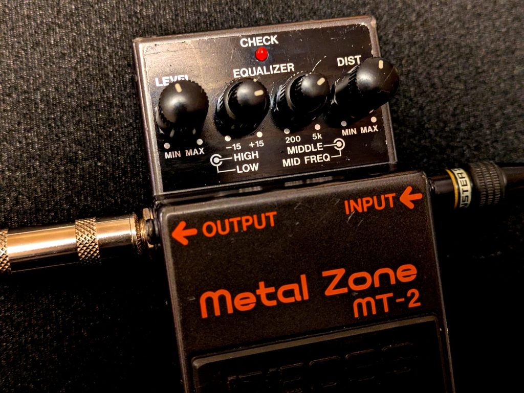 BOSS MT-2 Metal Zoneは、ハイゲインディストーションを象徴するエフェクターで、特にメタルやハードロックなどのジャンルで圧倒的な存在感を発揮します。迫力のあるサウンドを得られるのが大きな魅力ですが、その強烈な歪みの個性から、ブルースやジャズなど繊細なトーンが求められるジャンルにはあまり向かない傾向があります。3バンドイコライザーは、中音域の調整自由度が高く、MID FREQとMIDDLEの組み合わせで、繊細かつ多彩な音作りが可能です。イコライザーとディストーションの関係がこれ1台でわかってきます。さまざまなEQセッティングを試してプレイスタイルや楽曲に合わせた最適な音色を見つける楽しみがあります。MT-2は、100万台以上売り上げた実績を持つ名機です。一度は試してみてもよいかもしれません。
