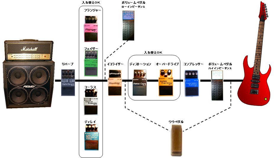 MT-2のようなディストーションはギター寄りに接続します。それから後ろ(アンプ寄り)に空間系のエフェクターをつなぐのが一般的です。オーバードライブがある場合はディストーションの前に入れる事が多いですが、わざと後ろに入れて順番を変えてみると、歪みのかかり方や質を変えることができます。順番は好みで変えてもまったく問題ありません。