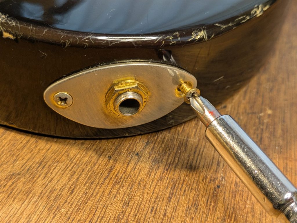 ギターのシールドジャックを開きます。ジャックプレートのネジをいくつか外すだけで簡単に修理することができますからぜひ挑戦してください。写真のギターではネジが2本のタイプです。ネジの頭に合ったドライバーを使いましょう。