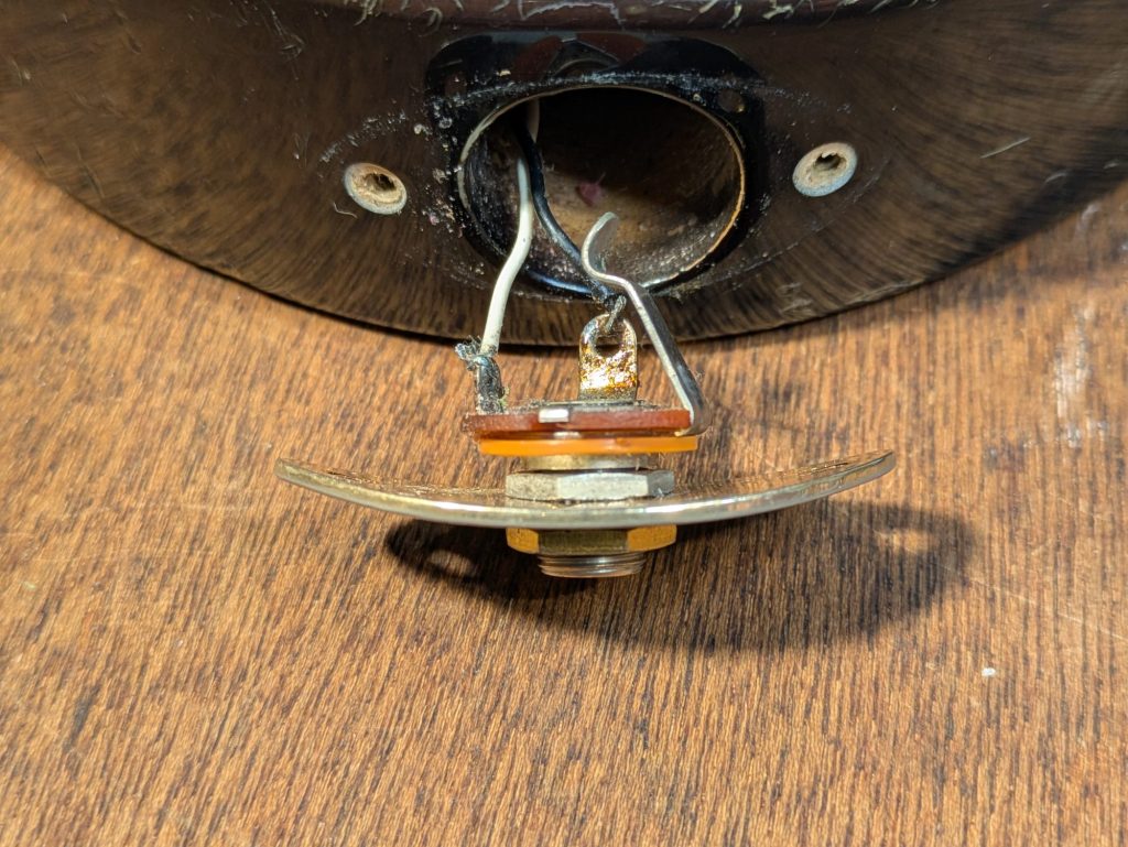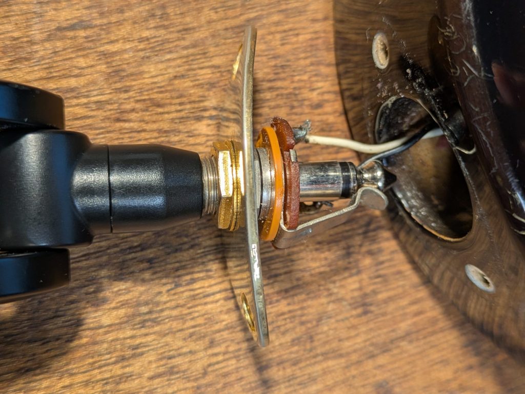 ギターワイヤレスをギターのシールドジャックに差し込んだ時、ワイヤレス本体がグラグラ動いたり回ったりなど、固定ができなくなったときの修理方法です。結論から言いますと、ギターのシールドジャックのホット端子を、手で少し曲げるだけで簡単に修理することができます。ジャックの端子がプラグをおさえつける力が少し弱いだけなのです。