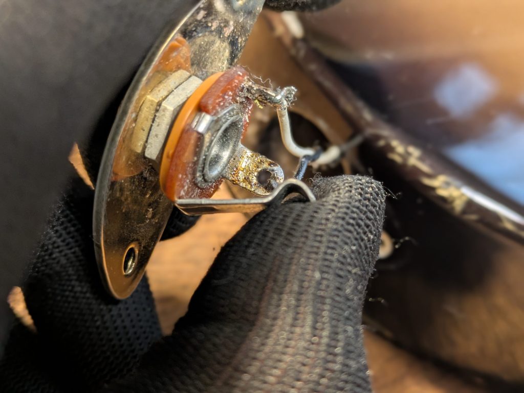 配線を切らないように慎重にジャックプレートを引き出します。配線が極端に短いギターもあります。無理をして全部を引き出す必要はありません。