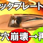 ギターのシールドジャックを開きます。ジャックプレートのネジをいくつか外すだけで簡単に修理することができますからぜひ挑戦してください。写真のギターではネジが2本のタイプです。ネジの頭に合ったドライバーを使いましょう。