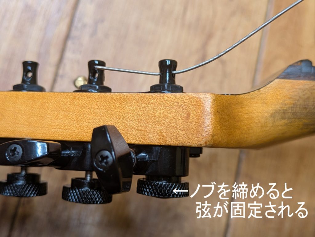 ③ペグ裏のロックノブやダイヤルを締め弦を固定します